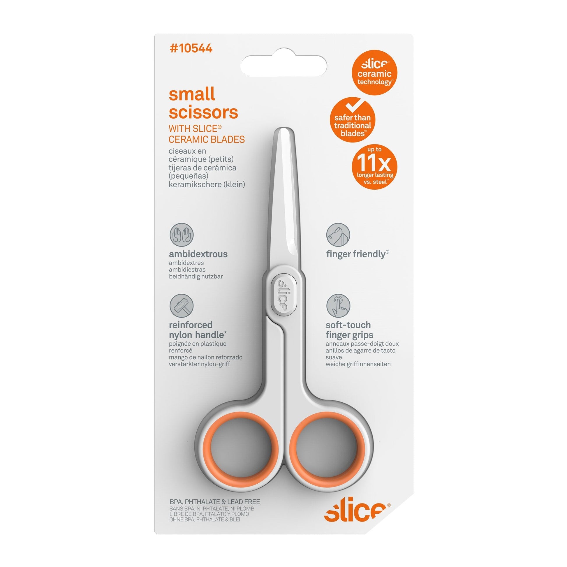 Las tijeras de cerámica Slice 10544 destacan por el patentado filo de seguridad que caracteriza a nuestros productos. Esto se traduce en que, aunque las tijeras cortan los materiales con gran eficacia, no existe riesgo de causar lesiones sobre la piel. Estas tijeras de cerámica son ideales para entornos industriales, institucionales y educativos debido a que cuentan con un diseño ambidextro, son ligeras y muy duraderas. El mango mezcla un tacto suave en el agarre con la robustez del nylon con fibra de vidrio para crear una perfecta combinación de fuerza y confort. Como todas nuestras cuchillas de cerámica, no producen chispas y son químicamente inertes.
