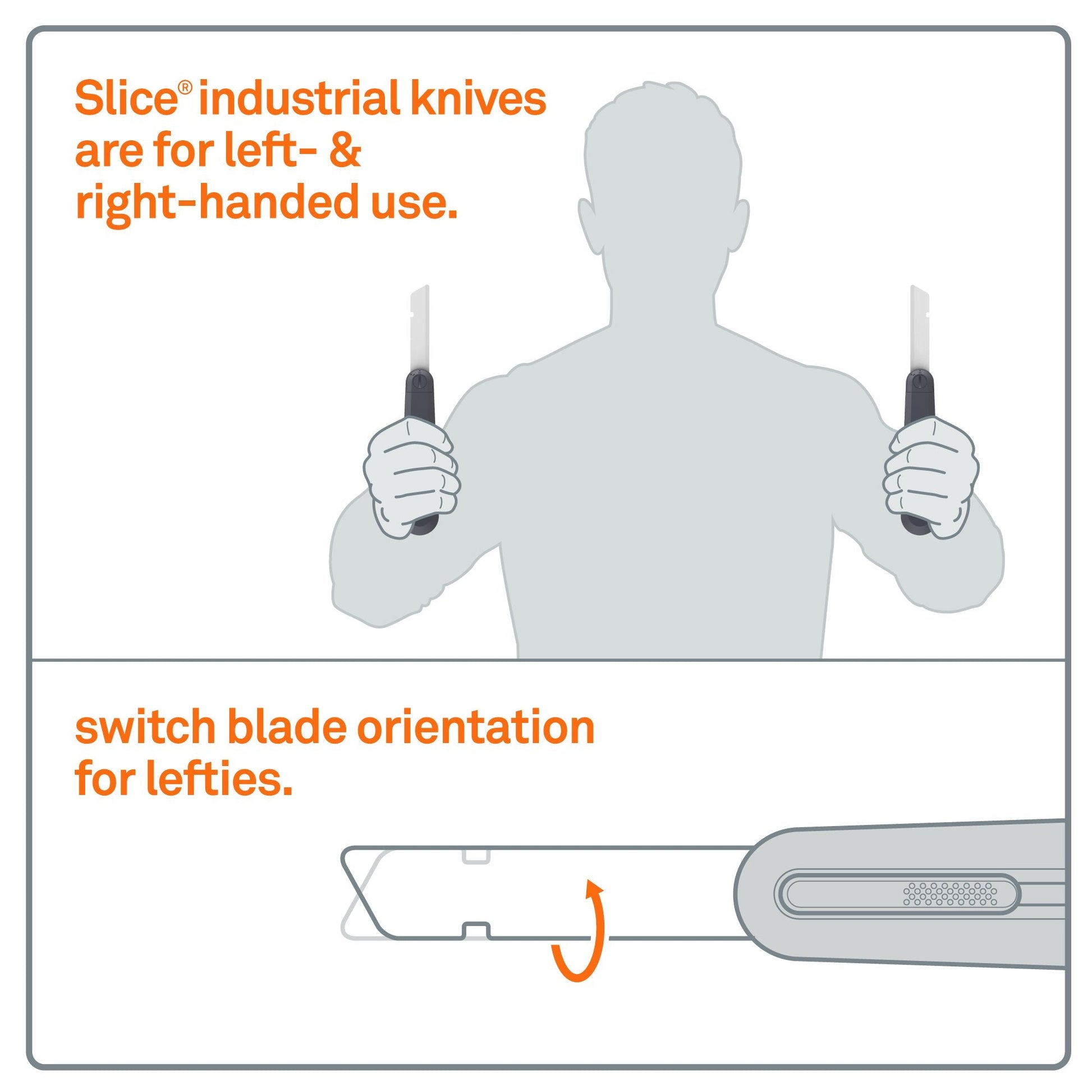 El cutter industrial autoretráctil Slice® 10560 incorpora nuestra cuchilla más larga y un mango muy duradero y resistente. Esta cuchilla finger-friendly®, diseñada para cortar espuma gruesa en entornos industriales, mide aproximadamente 7.5 centímetros de largo y permite cortar materiales más gruesos. Entre las características de seguridad de este cutter cabe destacar la retracción automática de la cuchilla y la cuchilla 10538 con punta redondeada (aunque también se puede utilizar la cuchilla 10539 en punta que se vende por separado). Además, el deslizador 10560 texturizado tiene surcos para maximizar la comodidad y mejorar el agarre.