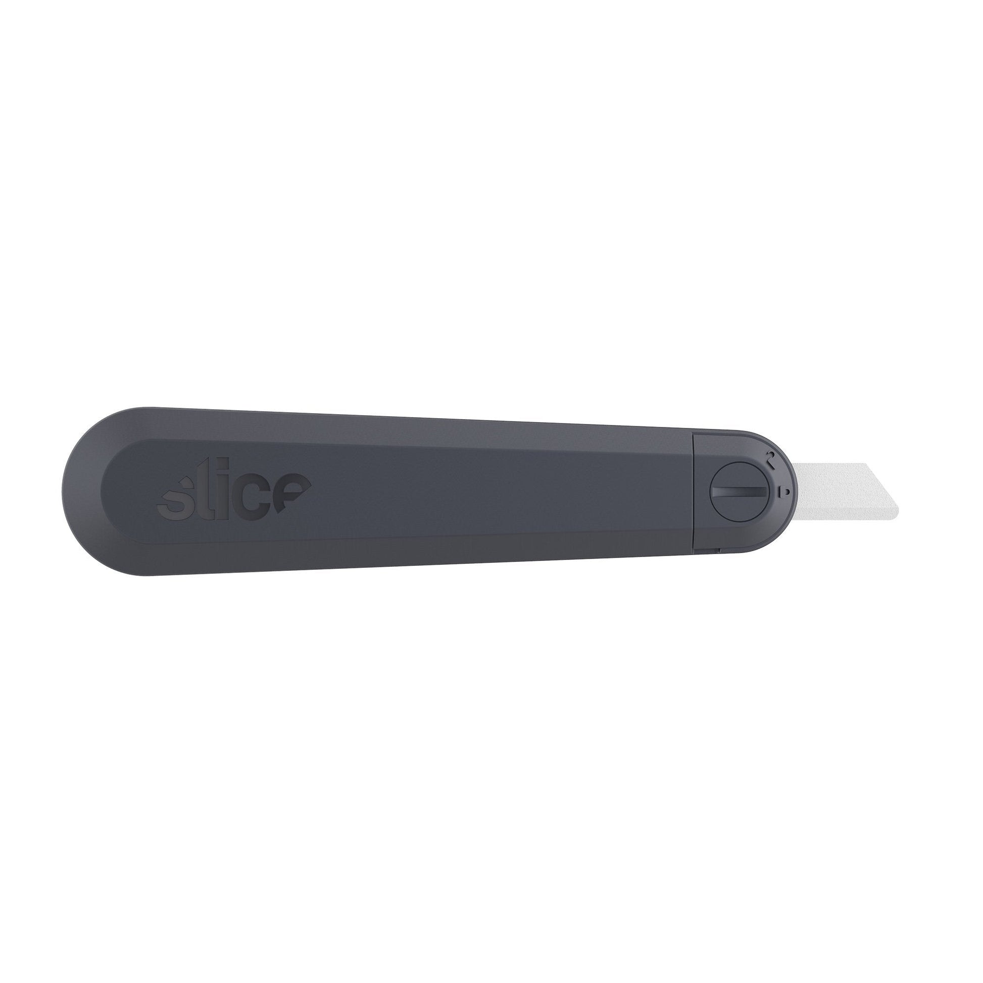 El cutter retráctil Slice 10554 puede cortar los mismos materiales que los cutters de acero inoxidable. Nuestro cutter retráctil de seguridad es compatible con dos tipos diferentes de cuchillas: en punta o con la punta redondeada. Ambos tipos tienen una longitud de 24 mm y le permitirán cortar a través de materiales gruesos como el cartón corrugado triple. El cutter profesional Slice 10554 se comercializa con la cuchilla cerámica 10526 de punta redondeada. Para la mayoría de las aplicaciones la punta redondeada es más segura, pero cuando necesite perforar para realizar el corte, por ejemplo, con materiales como película plástica, bandas plásticas, telas o placas de yeso, le aconsejamos utilizar la cuchilla cerámica 10528 en punta.
