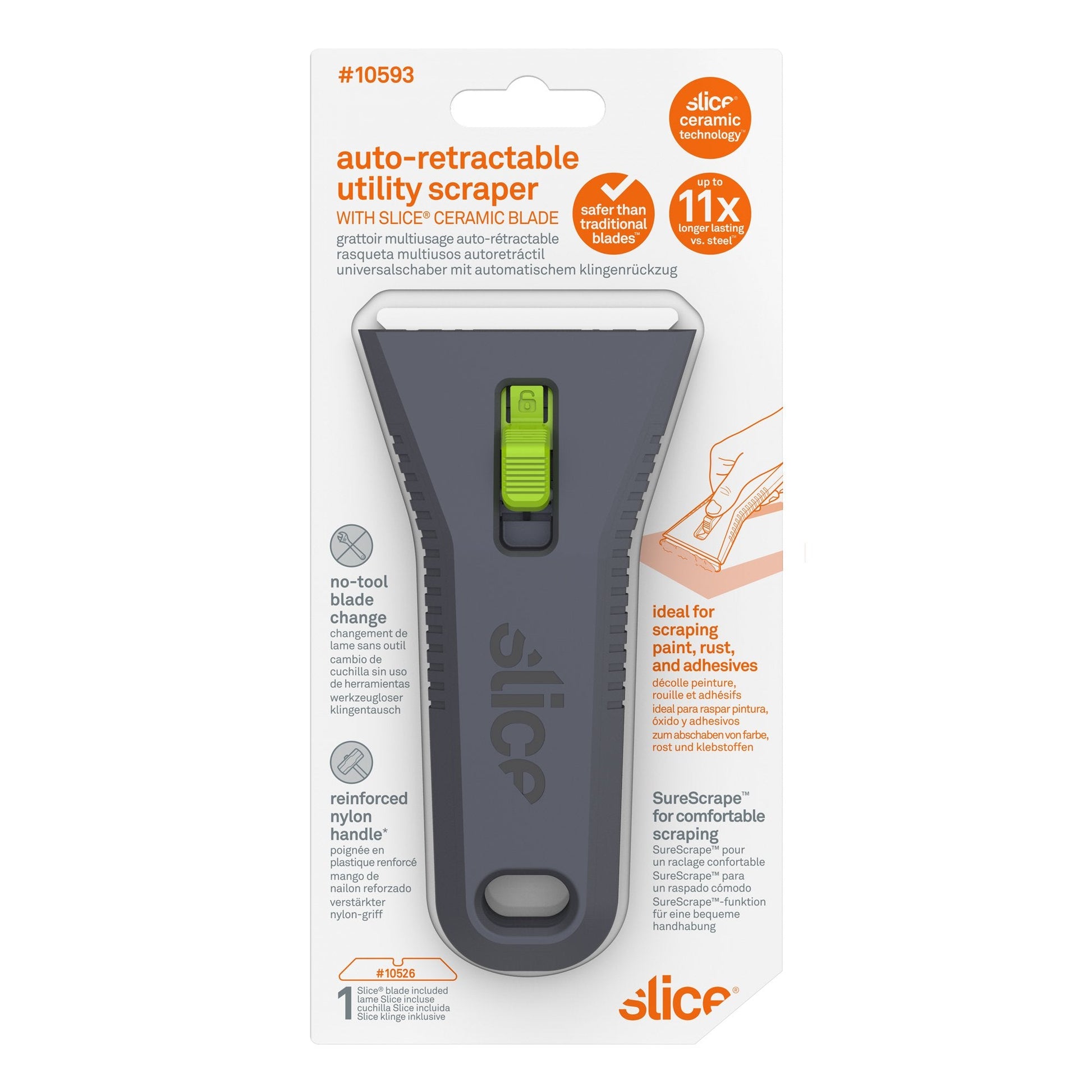 La rasqueta multiusos autoretráctil 10593 de Slice® es otro producto finger-friendly® de nuestro amplio catálogo de herramientas de seguridad. Incorpora una cuchilla de seguridad 10526 con punta redonda integrada en un mango de nailon reforzado, ergonómico y resistente con anillos de agarre de tacto suave para lograr la máxima comodidad. A diferencia de las rasquetas manuales, uno de los inconvenientes de las rasquetas autoretráctiles es que pueden causar tensión en la mano porque el pulgar del usuario absorbe presión mientras hace fuerza para mantener la cuchilla expuesta. Slice ha resuelto este problema con la tecnología SureScrape™, un mecanismo que reduce la tensión en la mano para que los usuarios no se vean obligados a elegir entre seguridad y comodidad. Al igual que el resto de las cuchillas cerámicas de Slice, la cuchilla 10593 es químicamente inerte, nunca se oxida y se fabrica sin aceites ni lubricantes.