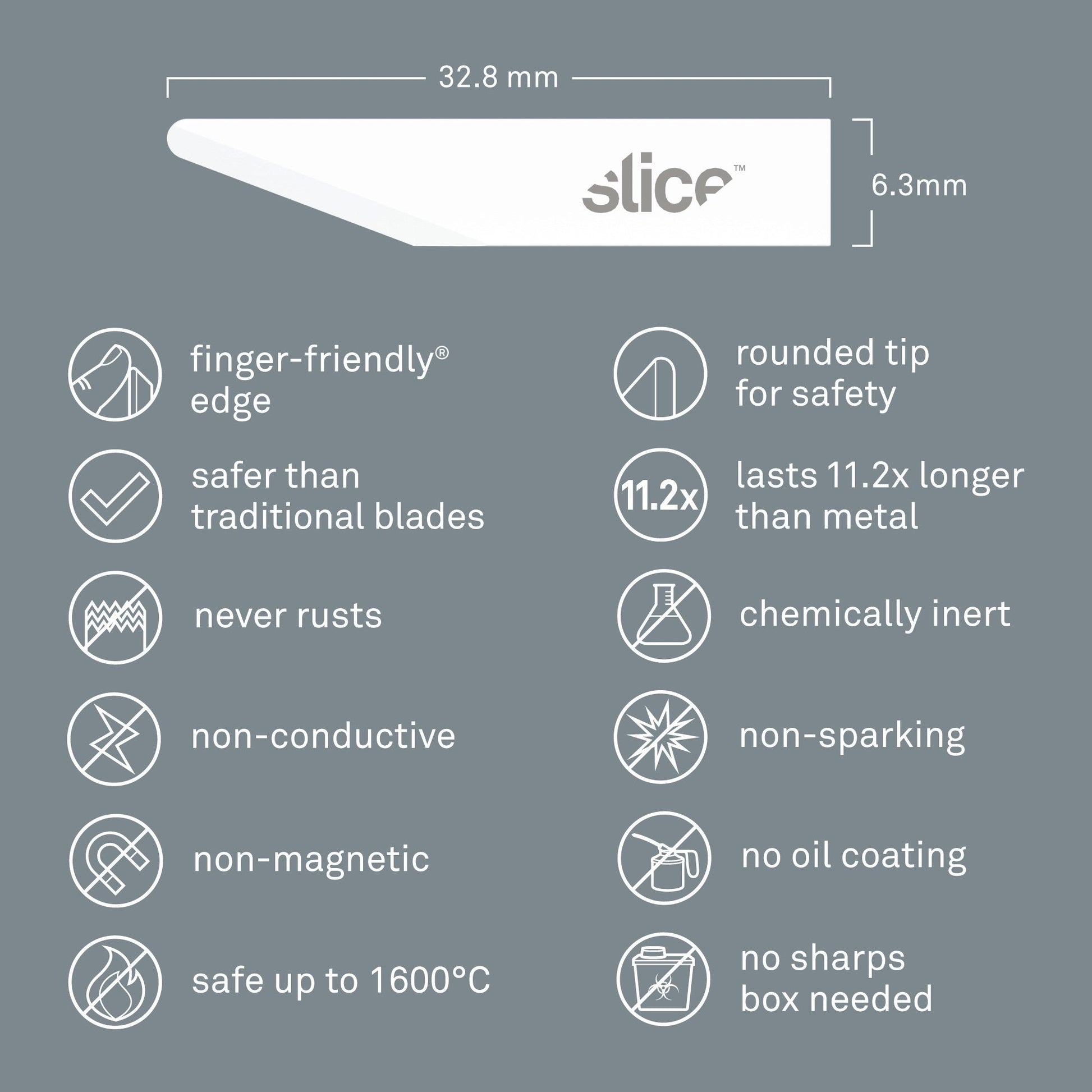 Las cuchillas para manualidades Slice 10518 son cuchillas de un solo filo que cuentan con un borde recto y una punta redondeada. Estas cuchillas están diseñadas exclusivamente para utilizar en nuestros cutters para manualidades y son ideales para realizar cortes y raspaduras perfectas. Al igual que el resto de las cuchillas cerámicas de seguridad de Slice, no producen chispas, no son magnéticas, son químicamente inertes, se mantiene en perfectas condiciones en temperaturas de hasta 1600 ºC, y nunca se oxidan. Nuestro filo de seguridad patentado corta los materiales con gran eficacia y de manera más segura.
