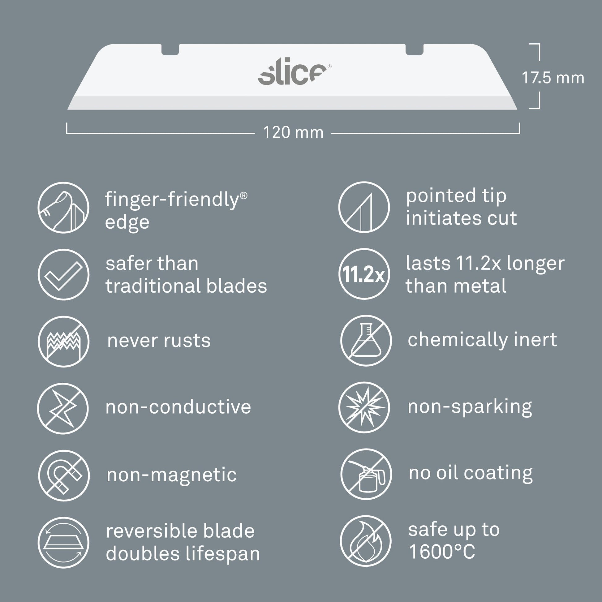 Las cuchillas industriales Slice® 10539 (en punta) cuentan con un extremo en punta diseñado para iniciar cortes limpios. Esta cuchilla extra larga de 12 centímetros es ideal para cortar materiales gruesos como la espuma y las placas aislantes que se utilizan en numerosos procesos de fabricación. Al igual que el resto de las cuchillas Slice, tienen un filo finger-friendly® que dura hasta 11 veces más que el de las cuchillas de metal, y que es más seguro para los dedos que el de las cuchillas tradicionales (ya sean cuchillas cerámicas o de metal). Además, las cuchillas Slice® 10539 no conducen la electricidad, no provocan chispas, nunca se oxidan, son químicamente inertes y no son magnéticas.
