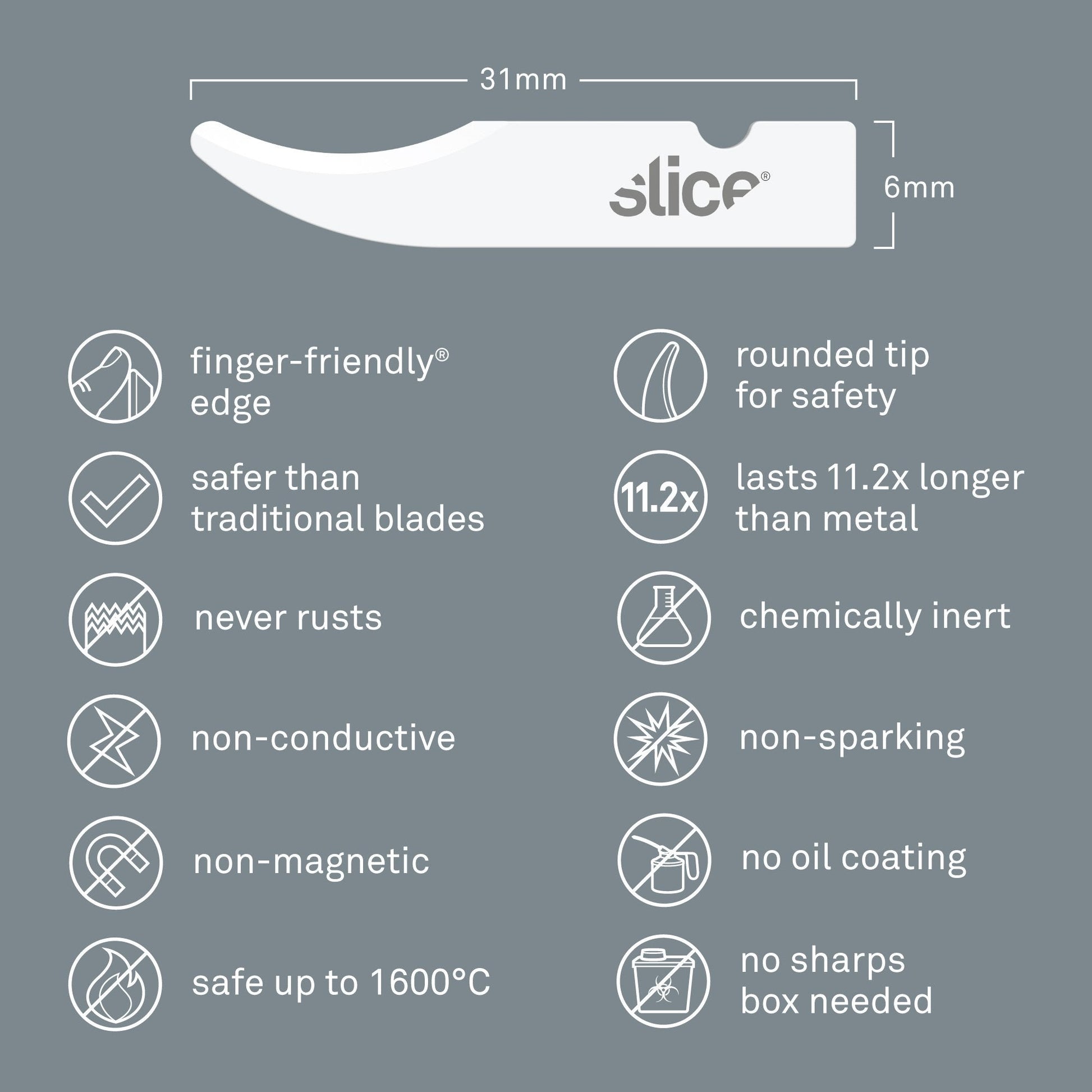 Las cuchillas para descosedor (punta redonda) 10536 de Slice son una alternativa más segura que los tradicionales descosedores. No solo tienen un filo finger friendly® seguro para los dedos sino que la punta redonda protege al usuario y a la tela de perforaciones accidentales. Estas cuchillas se pueden utilizar con los dos mangos para descosedores Slice, pero además también son compatibles con los dos cutters para manualidades de nuestro catálogo: el bisturí 10568 y el cutter de precisión. Al igual que las cuchillas utilizadas en el resto de las herramientas cerámicas de seguridad de Slice, las cuchillas para descosedor de punta redonda son químicamente inertes y nunca se oxidan, por lo que se evita que dejen manchas de óxido en los valiosos materiales. Y duran hasta 11 veces más que las cuchillas de metal, así que se minimizan los costes y se reducen las lesiones producidas a consecuencia de su uso.